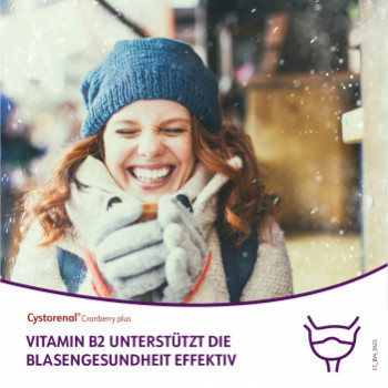 Cystorenal® Cranberry plus zum Erhalt einer gesunden Blase mit der besonderen Kombination aus Cranberry, Kürbiskern, Vitamin C und Vitamin B2. Vitamin B2 trägt zum Erhalt gesunder Schleimhäute bei, z. B. auch in der Blase; Vitamin C unterstützt die normale Funktion des Immunsystems und des Zellschutzes. Nur einmal täglich!